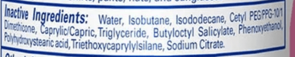Inactive ingredients: aloe barbadensis leaf (aloe vera gel) juice, aqua (deionized water), butyrospermum parkii (shea) butter, caprylic/capric triglyceride, citric acid, glycerin, glyceryl caprylate, glyceryl stearate citrate, glyceryl undecylenate, hydrolyzed jojoba esters, lecithin, polyhydroxystearic acid, tocopherol (vitamin e), tridecyl salicylate, xanthan gum.