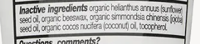 Inactive ingredients: Aloe Barbadensis Leaf Juice Powder*, Beeswax*, Butyrospermum Parkii (Shea) Butter*,Cocos Nucifera (Coconut) Oil*, Copernicia Cerifera (Carnauba) Wax*, Euphorbia Cerifera (Candelilla) Wax, Helianthus Annuus (Sunflower) Seed Oil*, Ricinus Communis (Castor) Seed Oil, Theobroma Cacao (Cocoa) Seed Butter*, Tocopherol