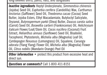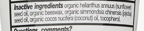 Inactive ingredients: Oryza Sativa (Rice) Bran Oil*^, Persea Gratissima (Avocado) Oil*^, Euphorbia Cerifera (Candelilla) Wax^, Octyldodecyl Oleate^, Simmondsia Chinensis (Jojoba) Seed Oil*^, Beeswax*, Theobroma Cacao (Cocoa) Seed Butter*^, Oryzanol^, Jojoba Esters^, Butyrospermum Parkii (Shea) Butter*^, Calendula Officinalis Flower Extract*^, Chamomilla Recutita (Matricaria) Flower Extract*^, Nasturtium Officinale (Watercress) Flower/Leaf Extract*^, Spiraea Ulmaria (Meadowsweet) Flower Extract*^, Bisabolol*^, Calophyllum Inophyllum (Tamanu) Seed Oil*^, Helianthus Annuus (Sunflower) Seed Oil*^, Tocopherol (Vitamin E)^. *CERTIFIED ORGANIC INGREDIENTS ^PLANT-BASED INGREDIENTS